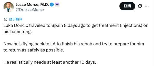 随后,名医Morse写道:“东契奇已于8天前飞往西班牙接受腿筋注射治疗。如今他将飞返洛杉矶,完成后续的康复训练,并力求以最安全的状态准备复出。从实际情况来看,他至少还需要10天的恢复时间。”换言之,Morse认为东契奇最快能在10天后复出。